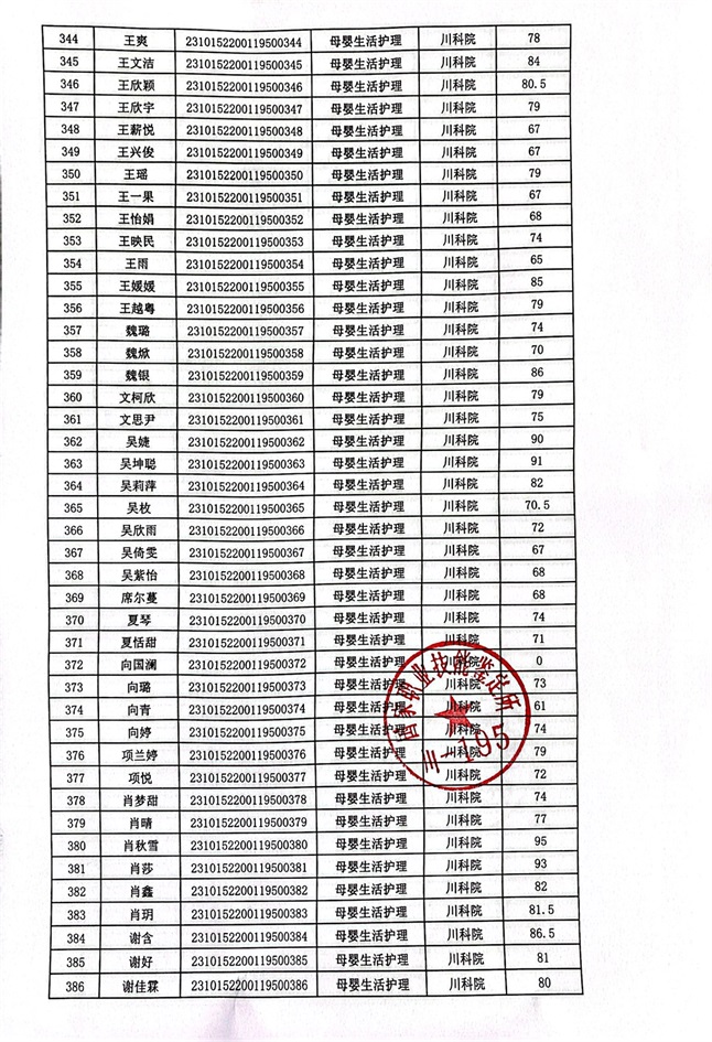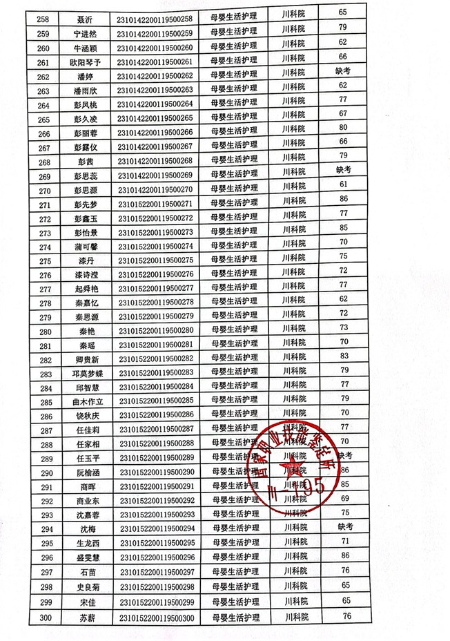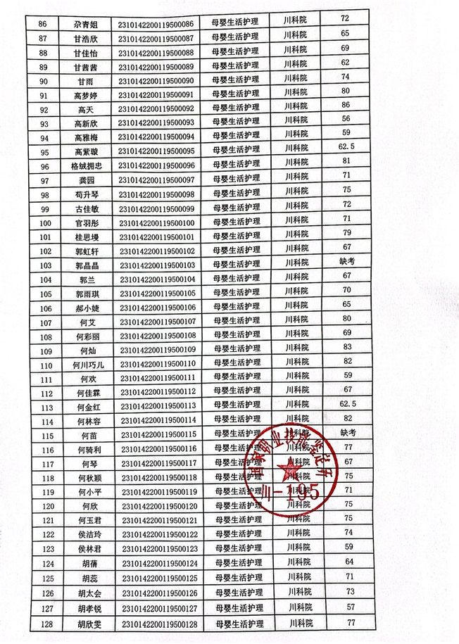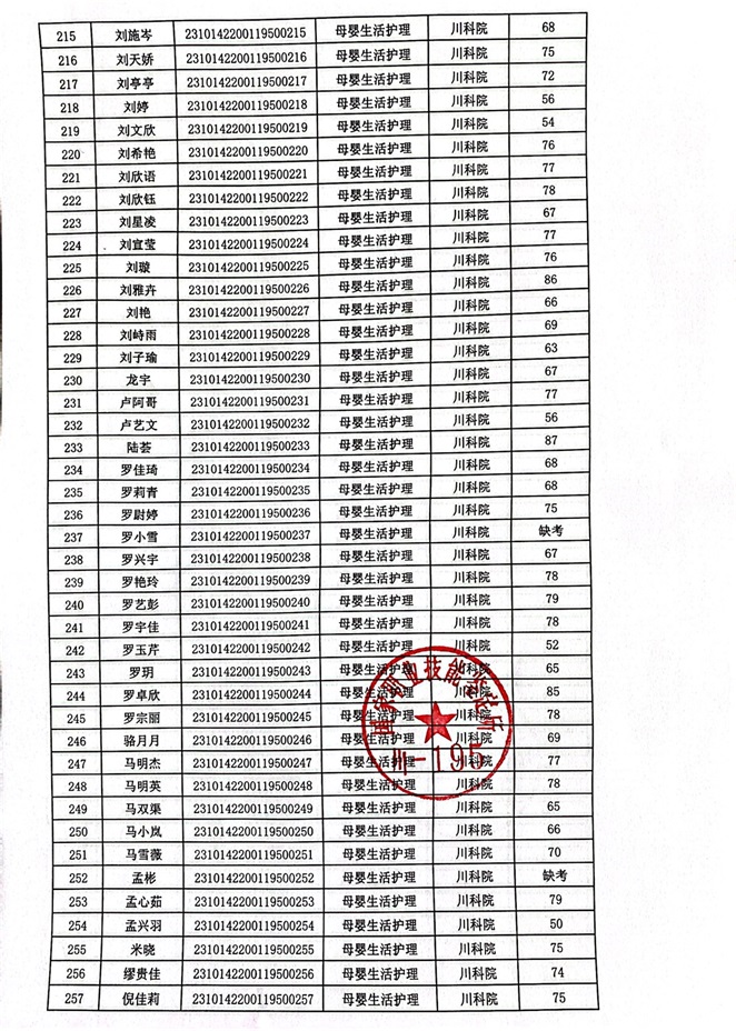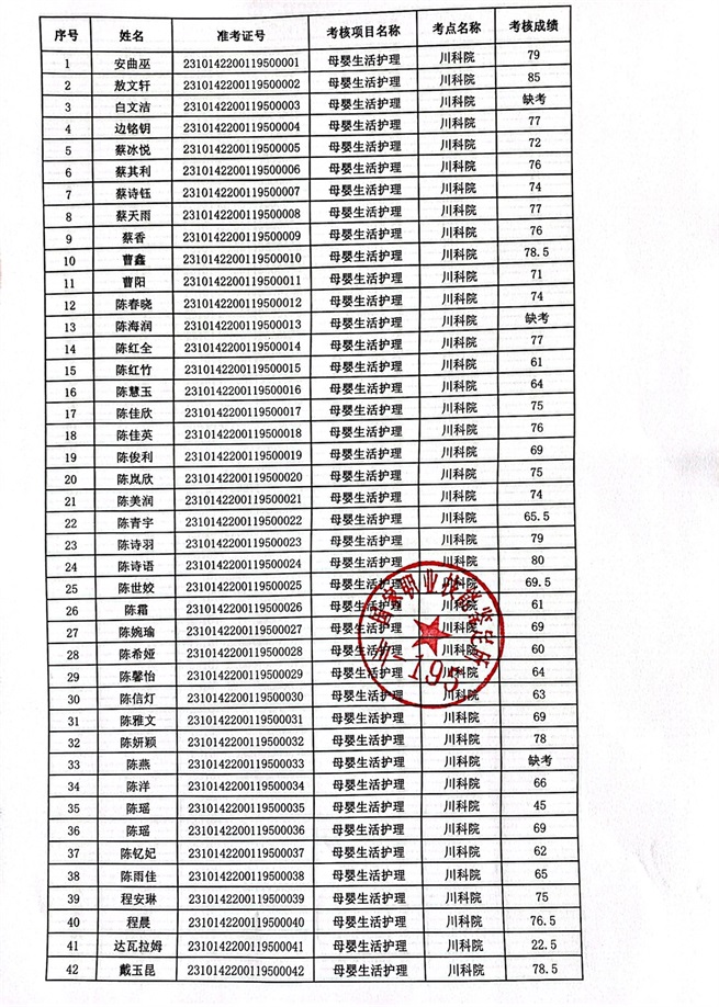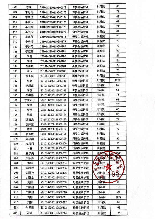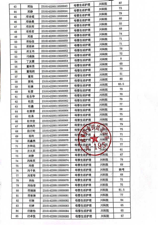 2023年10月14、15日母婴生活护理考核成绩公示