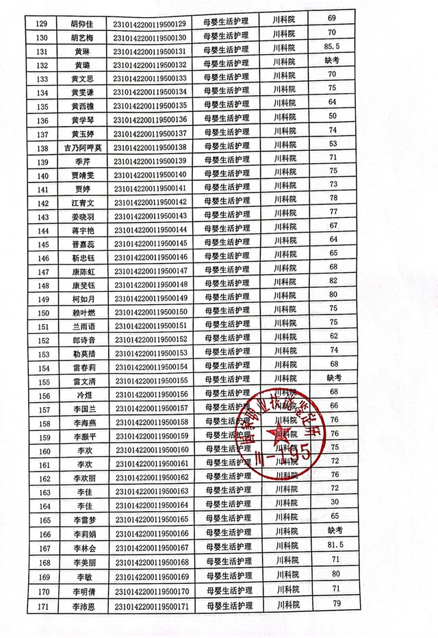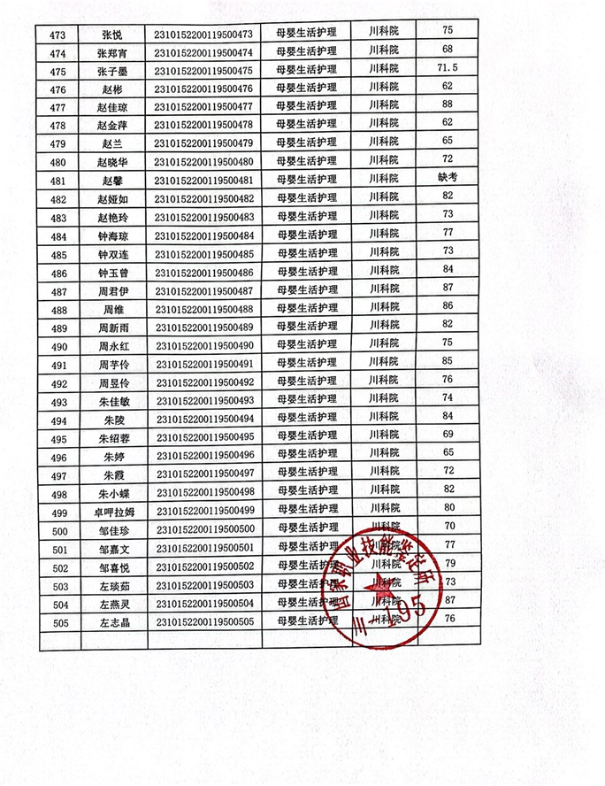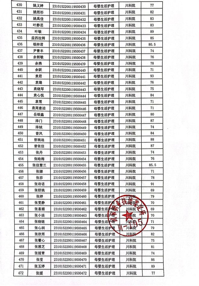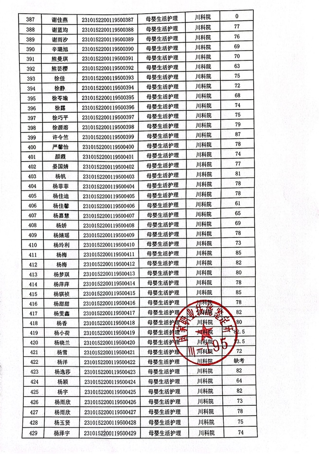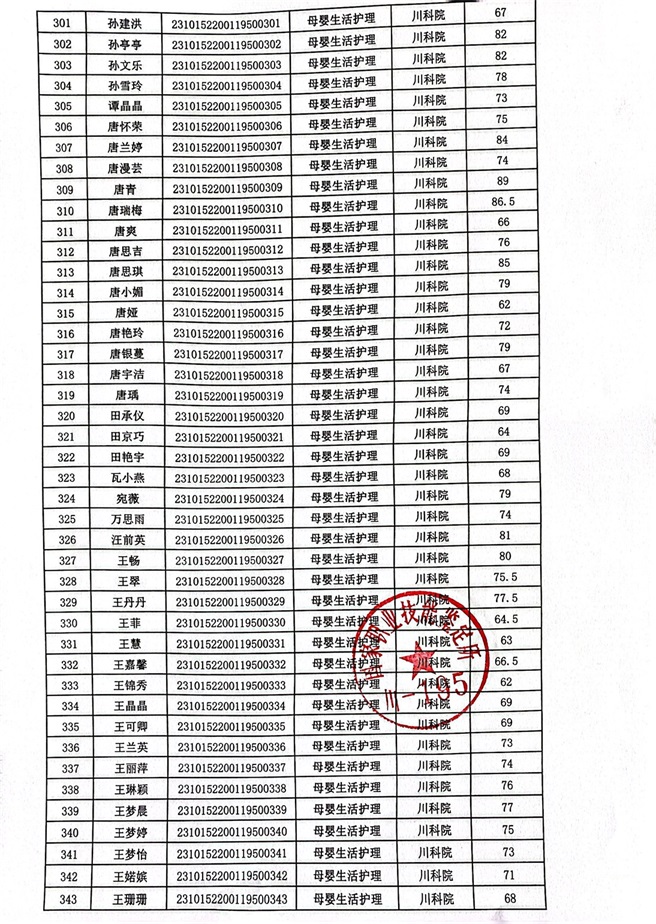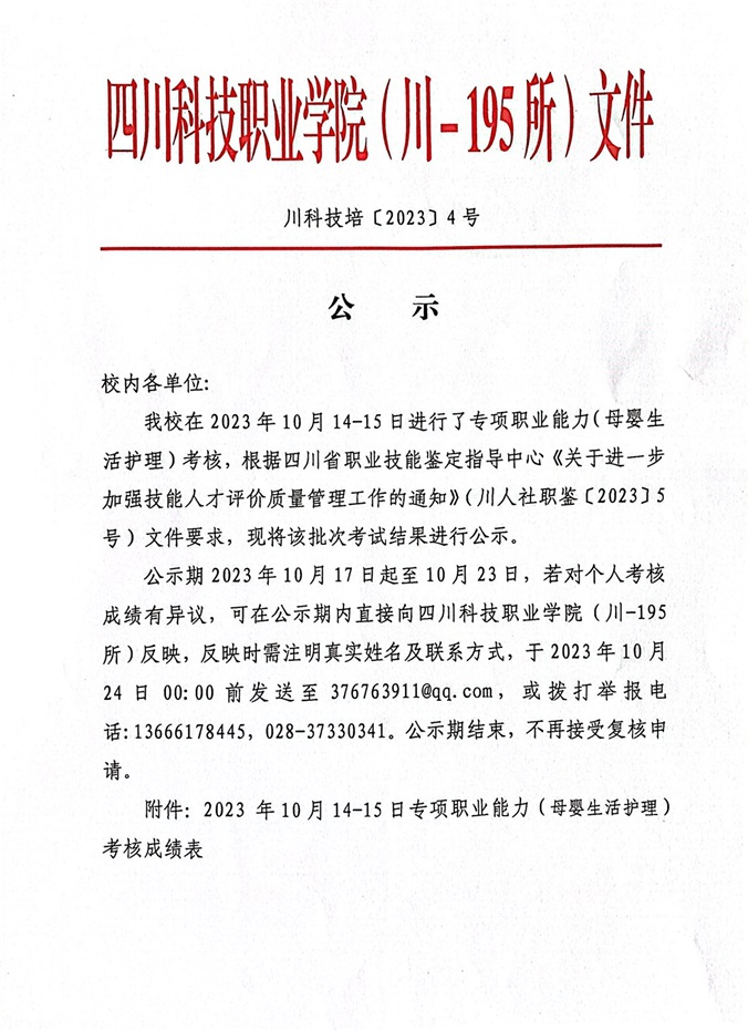 2023年10月14、15日母婴生活护理考核成绩公示
