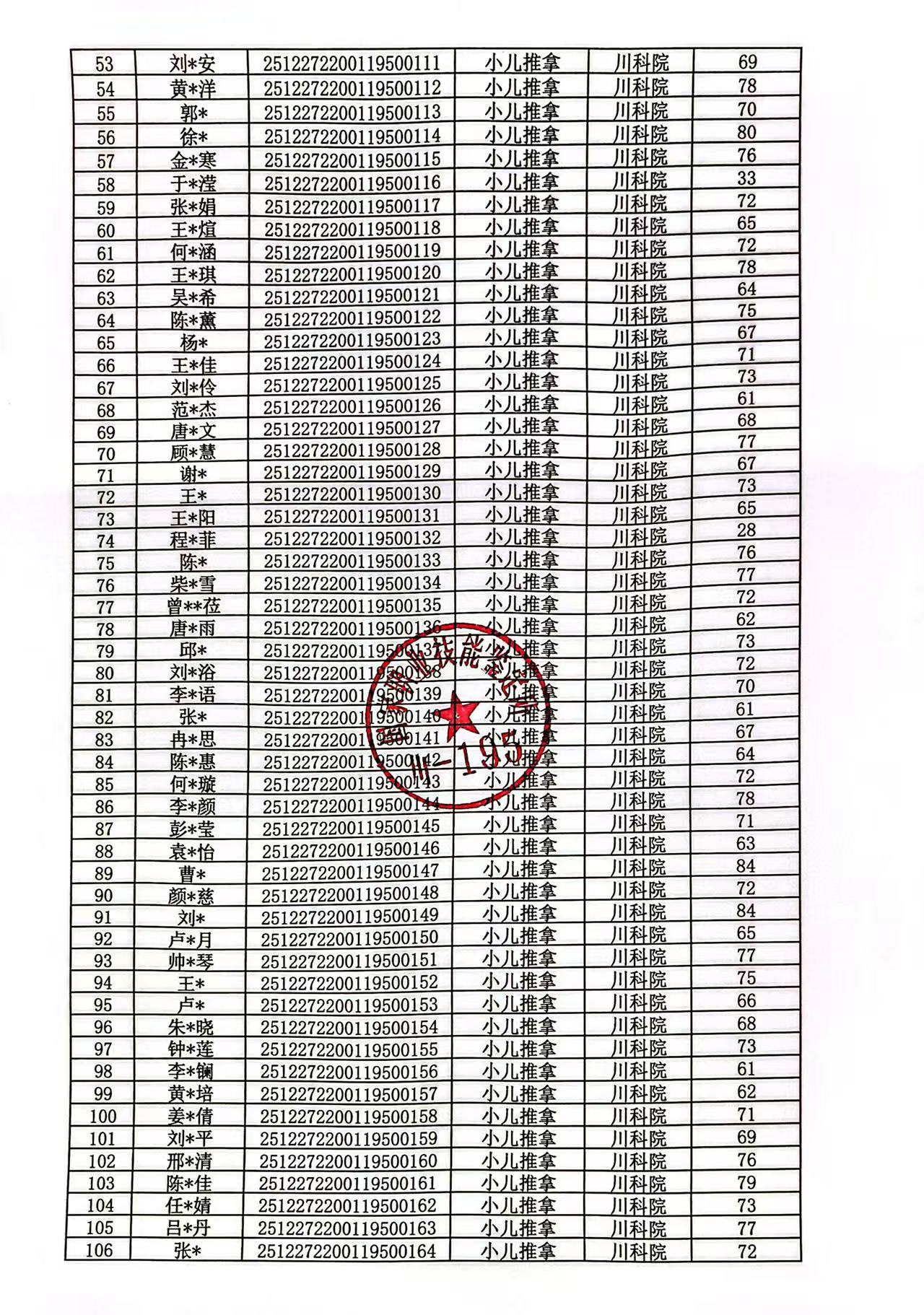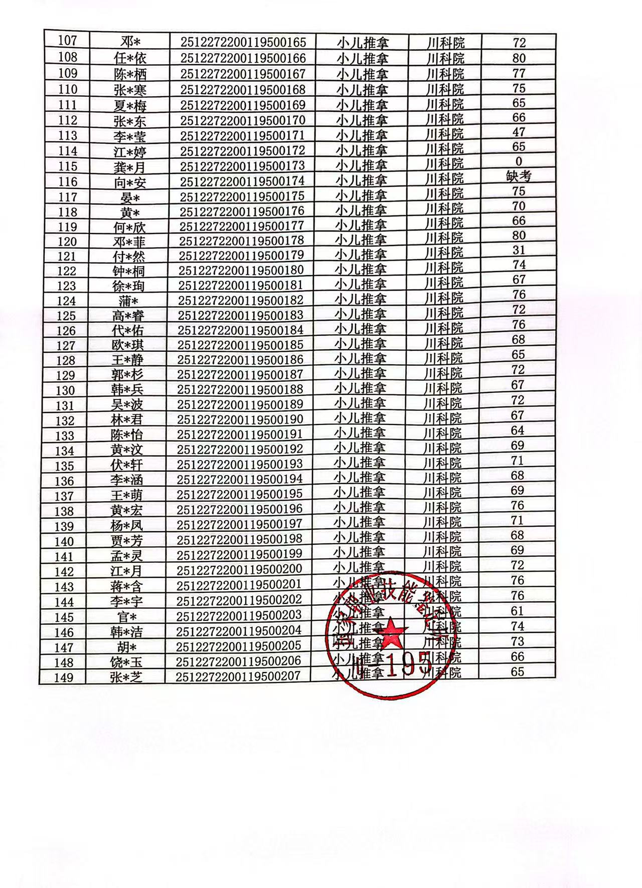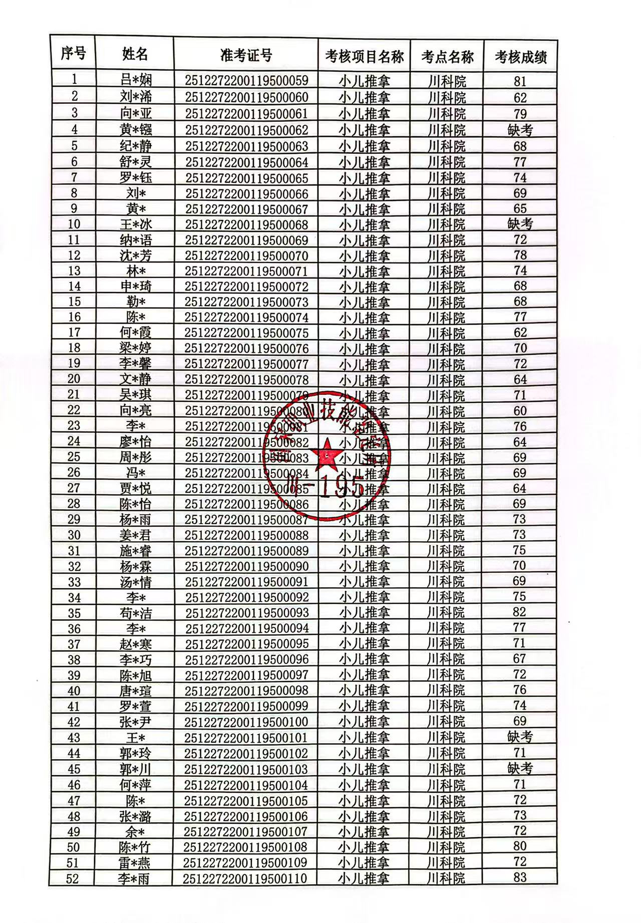 关于2025年12月27日专项职业能力(小儿推拿)考核成绩的公示